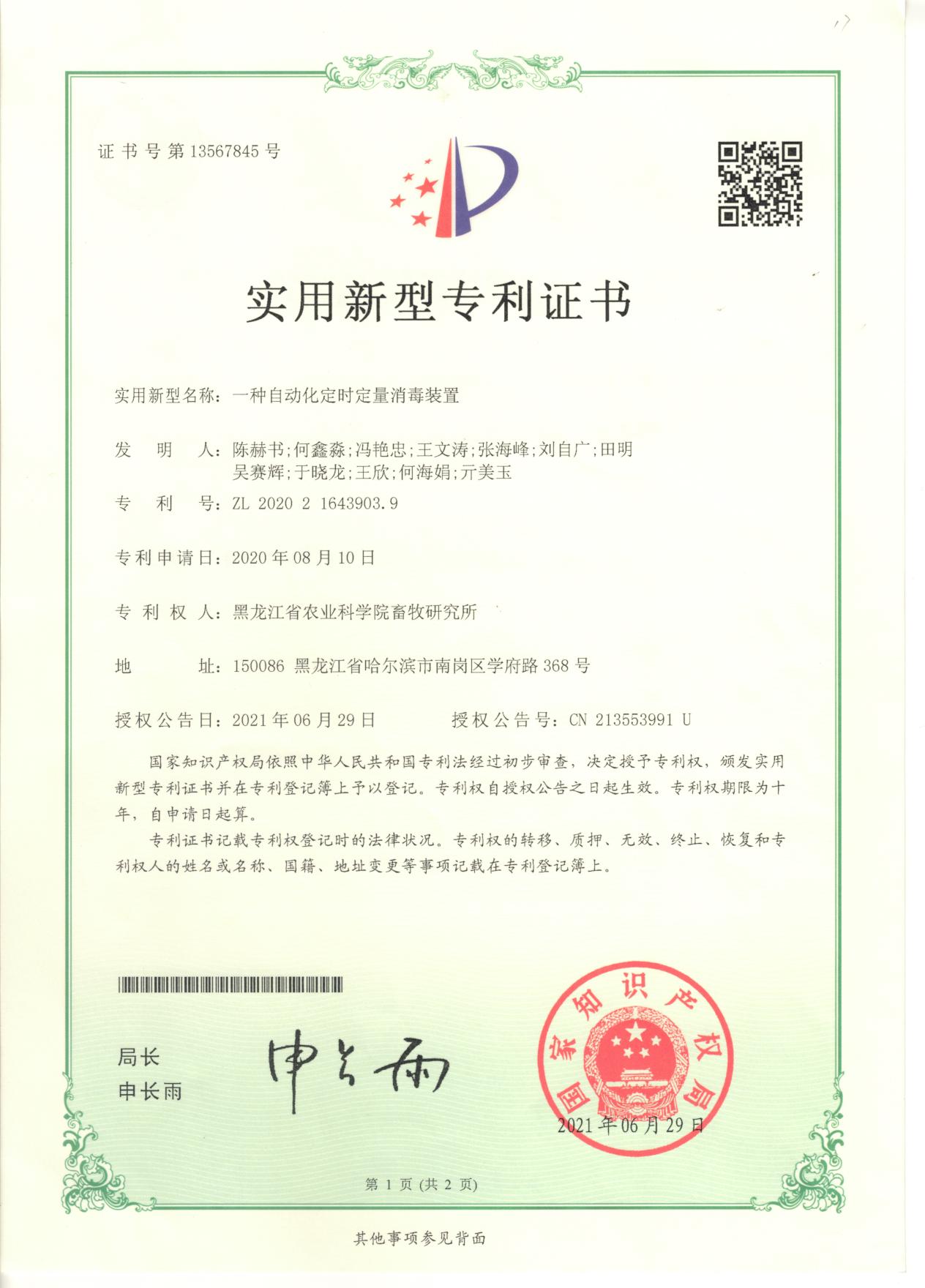 实用新型专利:本实用新型公开了一种自动化定时定量消毒装置,其包括消毒液储罐、管道阀门组合体、齿轮泵、消毒液喷头、定时开关和电源。其中消毒液储罐连接管道阀门组合体的进口端,管道阀门组合体的出口端连接齿轮泵的进口端,齿轮泵的出口端连接消毒液喷头,齿轮泵通过定时开关连接电源。本实用新型通过调节阀和齿轮泵的自动化控制,能按照预先设定的程序自动运行从而实现消毒的自动化,减少手动消毒操作的难度和工作量,提高消毒效率。