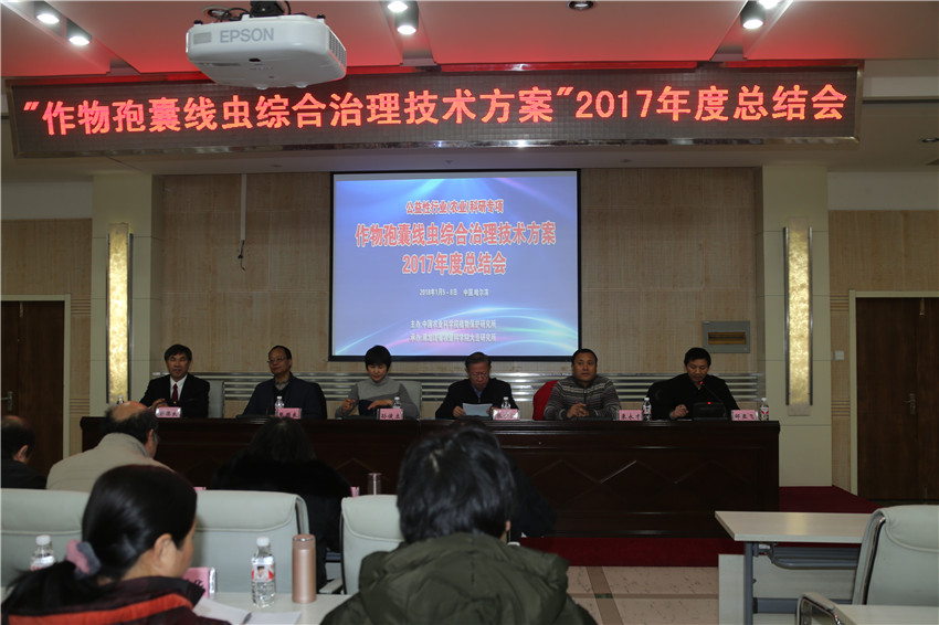 1月5日—7日,由中国农业科学院植物保护研究所主办,我院大豆研究所承办的公益性行业科研专项“作物孢囊线虫综合治理技术方案”2017年度总结会在我院主楼学术报告厅举行。 会议由中国农业科学院植物保护研究所科研处副处长邹亚飞主持。农业部科教司产业技术处调研员孙俊立,农业部天津环保所书记张国良,中国农业科学院植物保护研究所书记张步江,我院副院长来永才出席会议并致辞,项目首席专家、中国农业科学院植物保护研究所彭德良研究员及15家项目参与单位、2个项目试验基地负责人共计50余参加了会议。