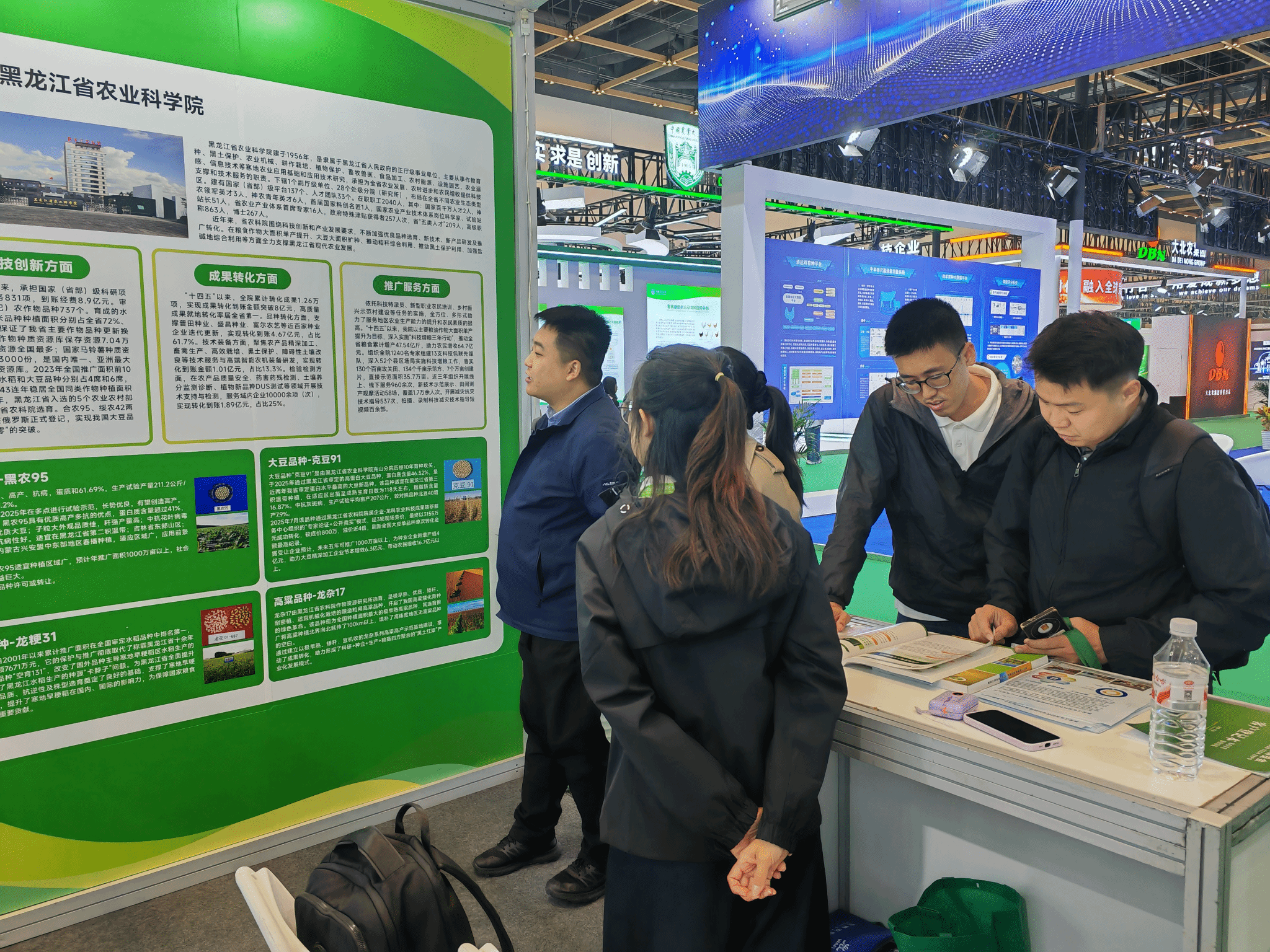 在世界农业科技博览会农业科研院校展区,我院以“寒地作物育种攻坚与产业赋能”为主题,系统构建了集品种展示、技术推介与产业对接于一体的综合性展陈平台。重点呈现我院在水稻、大豆、玉米等主要作物育种领域的突破性成果信息库、行业专家数据库及院属农业科技成果孵化和交易平台,充分展现了我院在寒地作物种质资源创新、品种选育及配套技术研发、推广转化、产业应用方面的系统布局与持续突破。