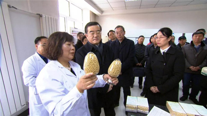 在我院大豆研究所一楼大豆成果展览厅,张庆伟书记了解了我院60多年来在大豆领域平台、团队和人才建设情况、育种体系、品种培育和推广、栽培技术等方面取得的优异成果,并详细询问了大豆品种繁育、生产工序、大豆亩产、区域种植等情况,与大豆所所长王广金,大豆育种专家陈维元、闫洪睿、王志新等进行了深入交流。在二楼考种配种室,张庆伟书记与正在进行选种配种工作、被媒体称为“金豆娘娘”的栾晓燕研究员进行了交流。张庆伟书记询问了栾晓燕团队正在开展的研究工作,肯定了农科院长期坚持的科研方向和作出的成绩。他强调,搜狗输入法下载 要抢抓大豆发展的重大机遇,发挥科技研发优势,培育优良品种,推广良种、良法,提高大豆品质,缩小技术示范与田间普遍应用的质量产量差距,要加强种子市场监管,把住良种直达地头的安全关,确保良种得以推广。要制定相关政策,鼓励农民扩大大豆种植面积,充分发挥农民合作社等新型经营主体的示范作用,完善生产服务体系,提高单产水平和生产效益,增强大豆市场竞争力和占有率。