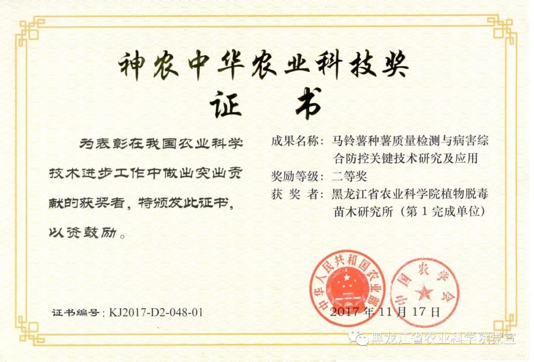 获奖类别、等级:2017年度神农中华农业科技进步二等奖