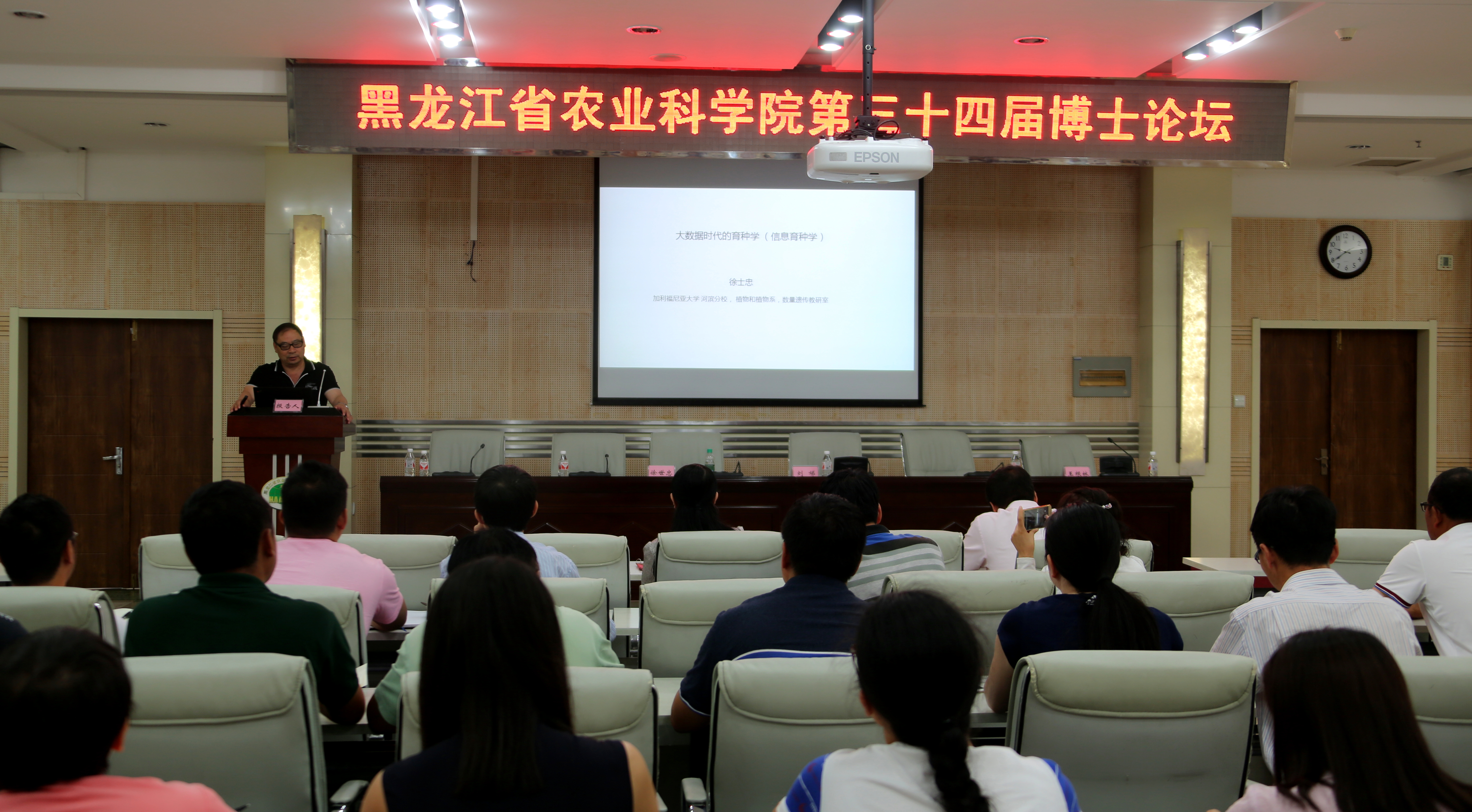 7月6日,由院博士创新联谊会主办,畜牧研究所承办的我院第三十四届博士论坛在院主楼一楼学术报告厅举行。本次论坛邀请到美国加利福尼亚大学河滨分校植物细胞生物学中心终身教授、博士生导师徐士忠博士作了题为《信息育种学》的报告。院博士创新联谊会成员和哈内各分院(所、中心)领导组织本单位科研人员等100多人在现场听取了徐教授的报告。同时,论坛还通过院视频会议系统向哈外各单位进行了同步转播。