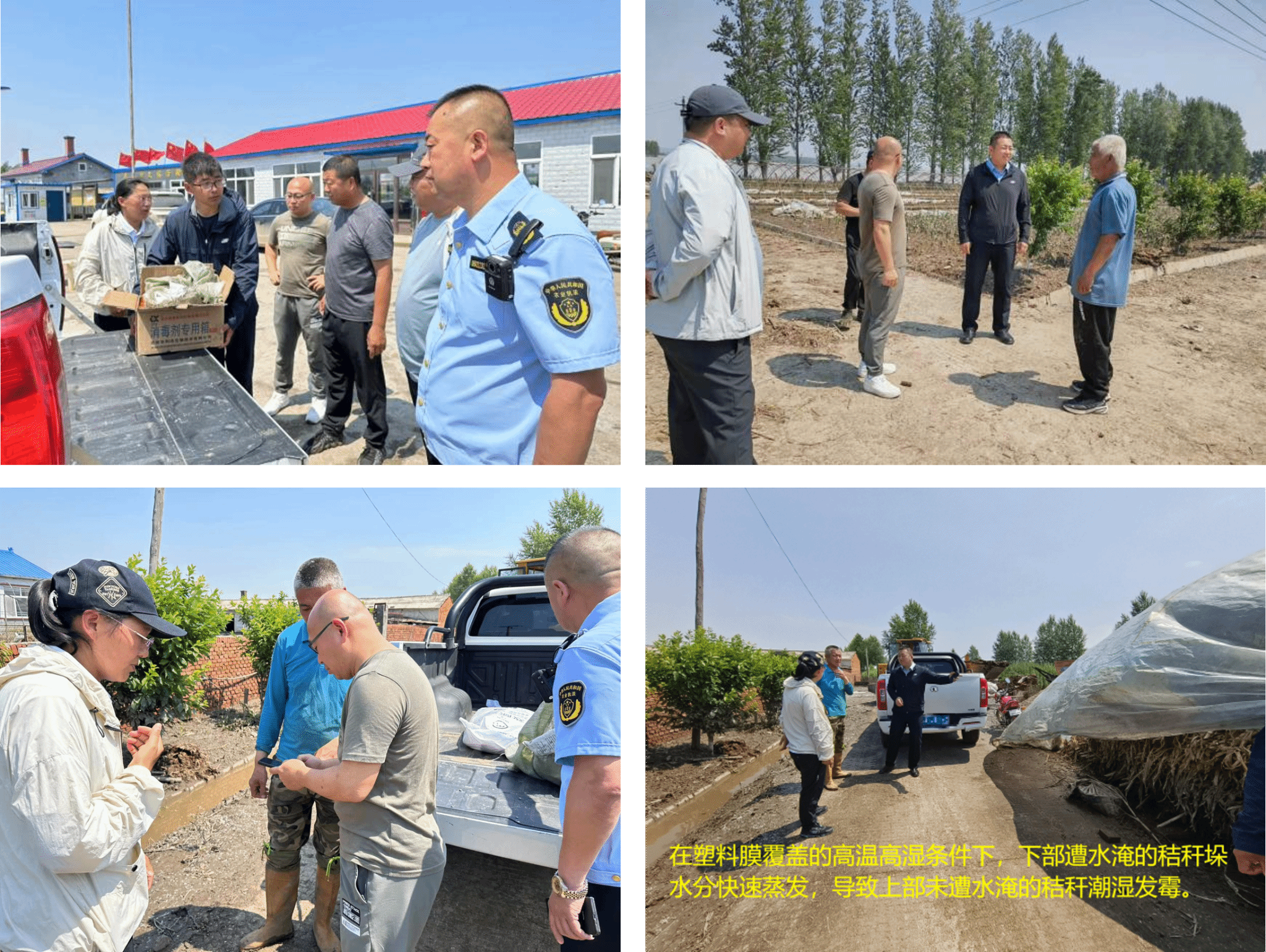 技术指导小组到达现场了解养殖户受灾情况,立即开展复产指导工作。一是增强养殖户汛期动物疫病防控意识,现场讲解相关知识,汛期内尽量采取舍饲,避免放牧染病,同时,个人要密切关注动物群体状态,发现病死及死因不明动物,要立即报备诊断,及时处置,对出现炭疽症状死亡的动物,严禁剖检。二是指导水淹圈舍环境管理,为受灾养殖户提供消毒药品,灭蚊蝇和寄生虫同时进行,同时保持舍内通风量最大化,加快地面和墙壁干燥,另就消杀步骤、注意事项、药品的选择和配备、个人防护等方面提供全方位的指导。三是检查高温高湿条件下饲草料质量,并告知水泡发霉的饲草料坚决不能饲喂,不能用作垫料,应及时采购,避免断草断料,储存过程中注意防潮、防湿。