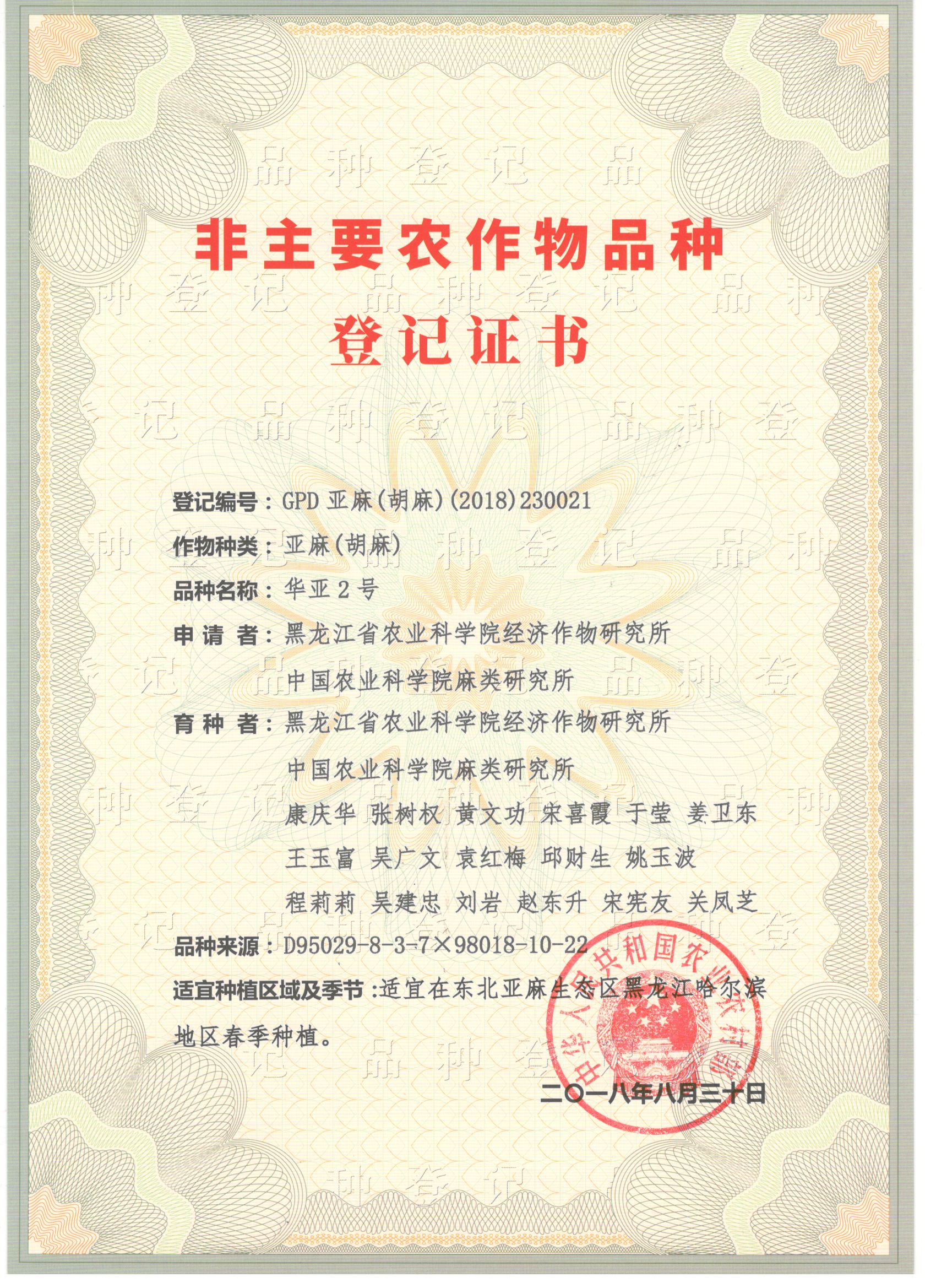 华亚2号:油纤兼用,在黑龙江生育日数76天,株高89.0厘米,工艺长度76.0厘米,分枝4.9个,蒴果6.7个,花蓝色,茎绿色。种皮褐色,千粒重4.7 g。粗脂肪含量36.0%。产量:原茎平均产量7645.8千克/公顷,比对照增产13.25%;纤维产量1698.4千克/公顷以上;种子产量1628.3 千克/公顷,出麻率28.3%。