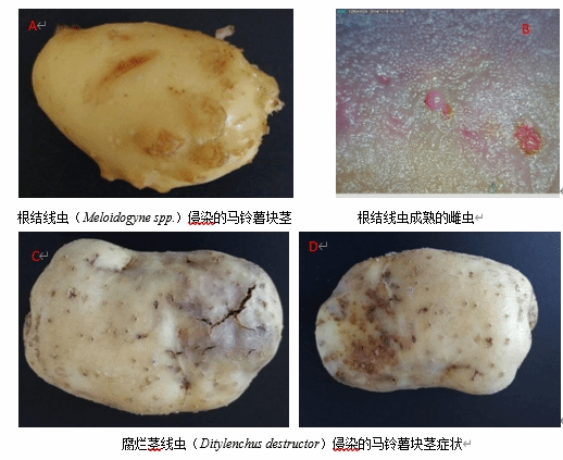 植物寄生线虫大多体长约0.3-1毫米,极少数达到4毫米左右,体宽约0.015-0.035毫米,近乎是“隐形”,肉眼很难看到。口针是它进攻的“武器”,对植物的根茎造成伤口,促进真菌、细菌和病毒等病原物的侵染。它在进食过程中分泌的消化液和多种酶类进入到植物的循环系统,影响植物的正常代谢发育,抗病材料地上部分不表现明显的症状,感病材料表现出生长衰弱或者植株矮小发黄症状,又常与缺素症混淆,这个小小的“敌人”就这样被我们忽视了。不进行防治,它就偷偷地在地下享受植物根茎这份美味,我们常吃的土豆也容易被线虫病害袭击,例如马铃薯孢囊线虫,马铃薯腐烂茎线虫,根结线虫和根腐线虫等,它们跟我们一样爱吃营养丰富的土豆。我们要如何才能发现这些“隐形”的敌人呢,这就要从植物的根系下手了。以根结线虫为例,根结线虫在侵染植物时,通过线虫的口针刺破植物表皮,食道腺细胞的分泌物随口针刺吸进入植物细胞,在这些分泌物的作用下,取食位点周围的细胞发生改变,随着时间的推移,体积逐步扩大,形成虫瘿。根表面看起来像“肿了”,与根肿病相似,这些肿块拿到室内在显微镜下切开就会看到大量的虫体。
