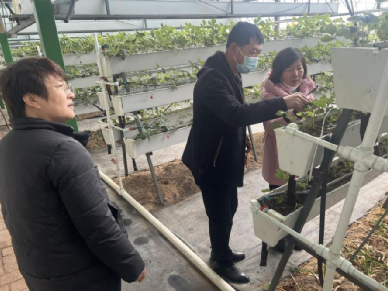 乐业镇乐业村的设施园区,由于今年是村集体管理温室,没有专业的技术人员管理,村书记临时上阵摸索种植,存在草莓苗徒长、畸形果较多,白粉病、灰霉病、红蜘蛛等病虫害发生以及温湿度管理不到位等现象。科技特派员杨瑞华对这些问题给出了栽培管理建议,并对今后气温回升的管理、促花促果以及病虫害的防治方法提出建议,对于现有棚室结构最上面临近棚顶的两层作业不方便槽体,提出拆除建议,可以有效缓解后墙及下部种植槽的光照问题;对低温问题提出增加二层膜的设置,可有效改善冬季温度低造成的冻害及生长不良问题。