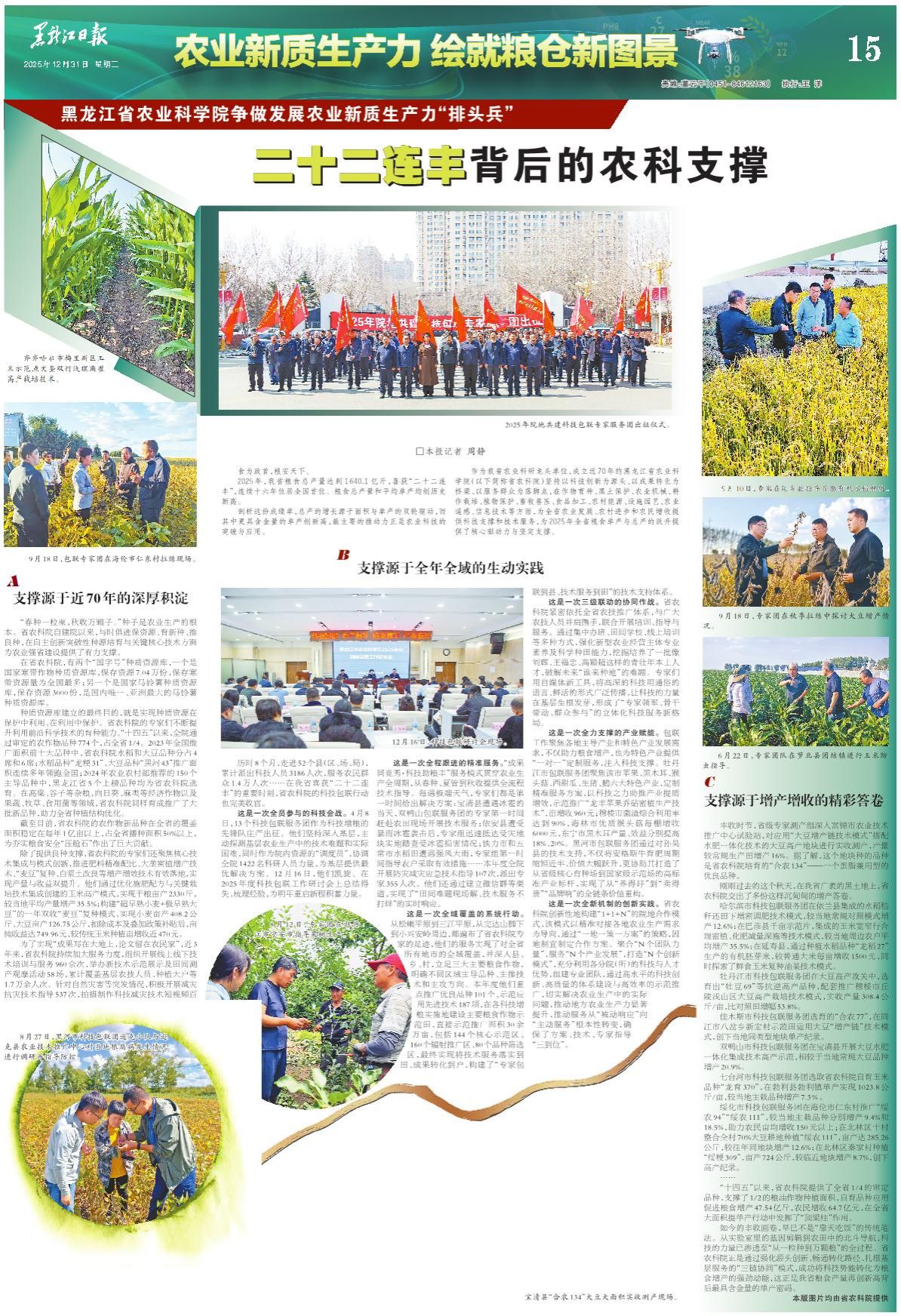 这是一次全员参与的科技会战。4月8日,13个科技包联服务团作为科技增粮的先锋队庄严出征。他们坚持深入基层,主动探测基层农业生产中的技术难题和实际困难,同时作为院内资源的“调度员”,协调全院1422名科研人员的力量,为基层提供最优解决方案。12月16日,他们凯旋。在2025年度科技包联工作研讨会上总结得失、梳理经验,为明年重启新程积蓄力量。