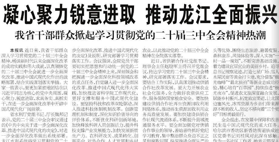 连日来,我省干部群众深入学习贯彻党的二十届三中全会精神,畅谈新时代以来全面深化改革的成功实践和伟大成就,认真领悟党的二十届三中全会就进一步全面深化改革、推进中国式现代化作出的战略部署,结合实践谋划落实举措。大家一致表示,要更加紧密地团结在以习近平同志为核心的党中央周围,凝心聚力、锐意进取,求真务实、真抓实干,在进一步全面深化改革中开辟中国式现代化广阔前景。省水利厅党组书记、厅长魏邦记表示,党的二十届三中全会审议通过的《...