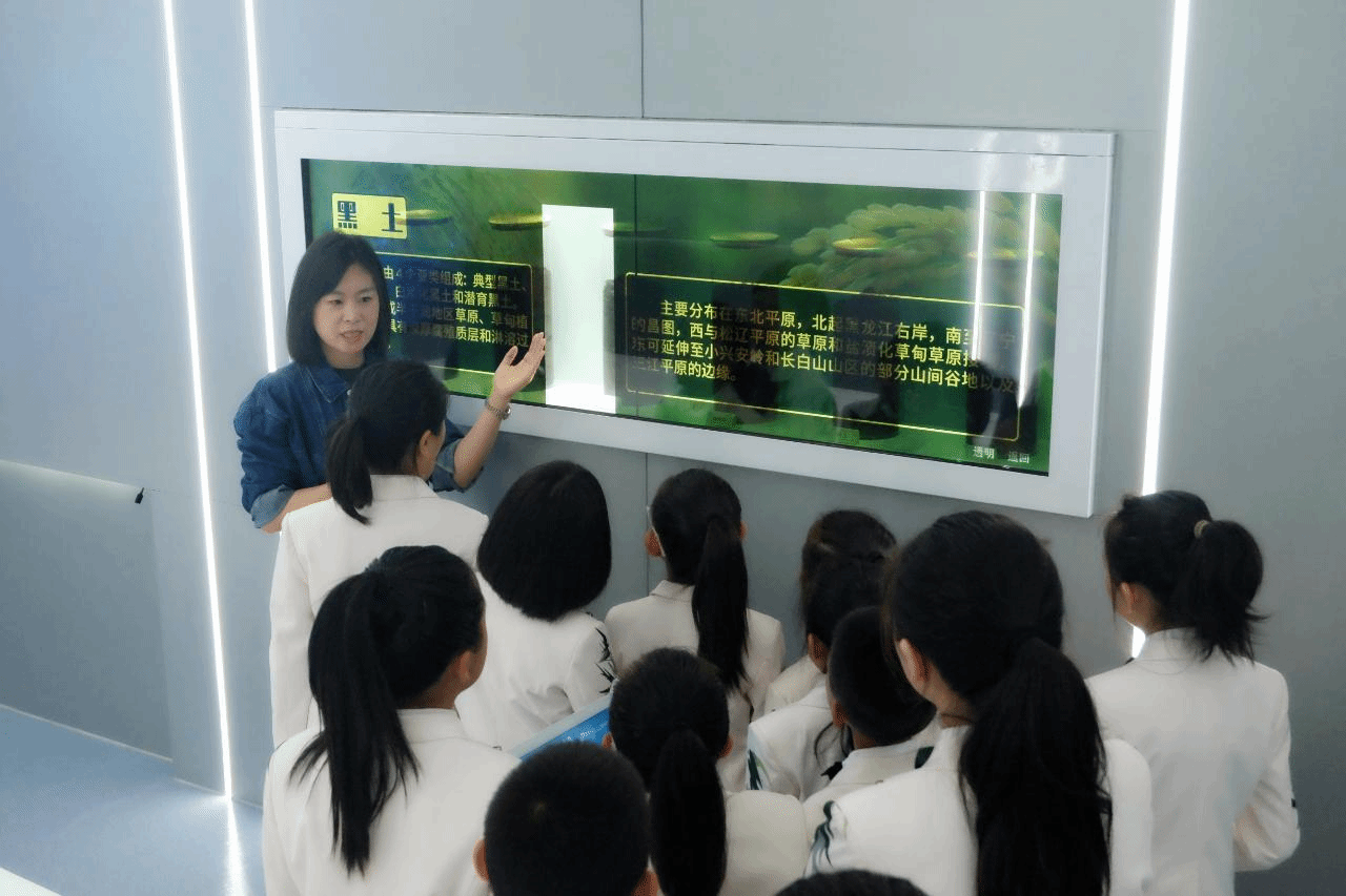 走进大数据中心展厅,展厅内的滑轨屏吸引了孩子们的目光,虚拟讲解员向孩子们介绍了农业从1.0到4.0的发展史,从最初依赖人力畜力的传统农耕,到如今智能化、信息化的现代农业,孩子们直观地感受到农业发展的巨大跨越。关于黑龙江大农业发展现状和搜狗输入法下载 “当家品种”的介绍,让孩子们更深刻了解到家乡作为全国粮食生产第一大省的重要地位,以及背后农业科技的强大支撑。“无人农场”和“智能温室”短片展示了无人驾驶的农机在农田上方精准作业,智能温室里各类传感器实时监测并调控环境参数的场景,引发学生们阵阵惊叹。