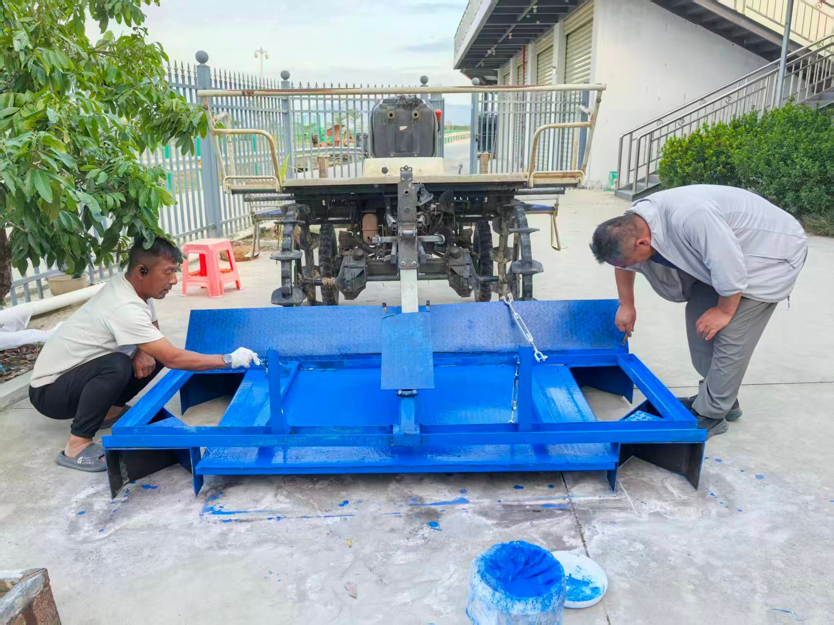 面对这一难题,我院南繁基地的科研人员主动作为,在基地负责人尹向前的大力支持下,跨单位、跨专业的协同攻关迅速展开。牡丹江分院孙玉友研究员主动将自家插秧机千里运至海南作为改造基础;栽培所周劲松副研究员充分发挥多年水稻栽培经验,精心设计机器结构与尺寸;黑河分院朱海芳利用休息时间手工焊接机器主体,大庆分院陈善和全程参与焊接与调试,确保各部件达标。
