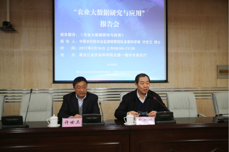 2月16日,“农业大数据研究与应用”报告会在院主楼一楼学术报告厅举行。哈内各所100余名科研人员参加了培训,哈外各分院、研究所的科研人员通过院网络会议平台同步收看了转播。 报告会由院科研处和信息中心联合主办,李文华院长主持报告会并做重要讲话。中国农科院信息所农业监测预警团队首席科学家、农业部市场预警专家委员会秘书长、时任中国农业科学院农业信息研究所所长许世卫博士受邀做报告,整个报告历时两个多小时。