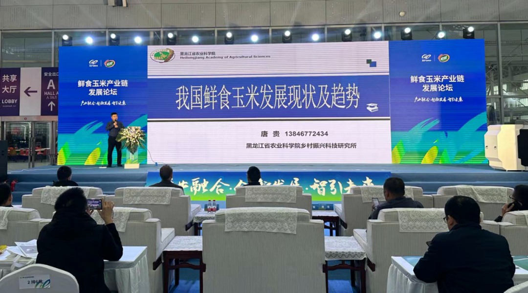 展会同期还举办了“2023玉米产业高质量发展论坛”、“鲜食玉米产业链发展论坛”、“饲料及养殖产业论坛”、 “玉米产业新产品、新技术发布会”等活动,我院卢淑雯副院长受邀作为颁奖嘉宾为“2023黑龙江玉米深加工十强企业”授牌,乡村振兴科技研究所玉米研究室唐贵主任在“鲜食玉米产业链发展论坛”受邀作了大会报告。