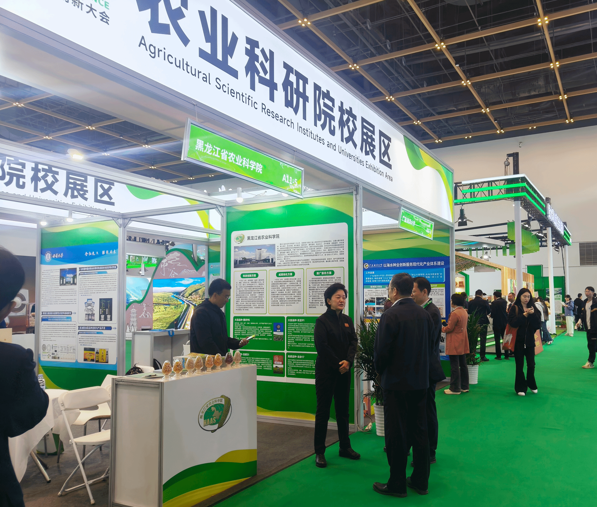 在世界农业科技博览会农业科研院校展区,我院以“寒地作物育种攻坚与产业赋能”为主题,系统构建了集品种展示、技术推介与产业对接于一体的综合性展陈平台。重点呈现我院在水稻、大豆、玉米等主要作物育种领域的突破性成果信息库、行业专家数据库及院属农业科技成果孵化和交易平台,充分展现了我院在寒地作物种质资源创新、品种选育及配套技术研发、推广转化、产业应用方面的系统布局与持续突破。