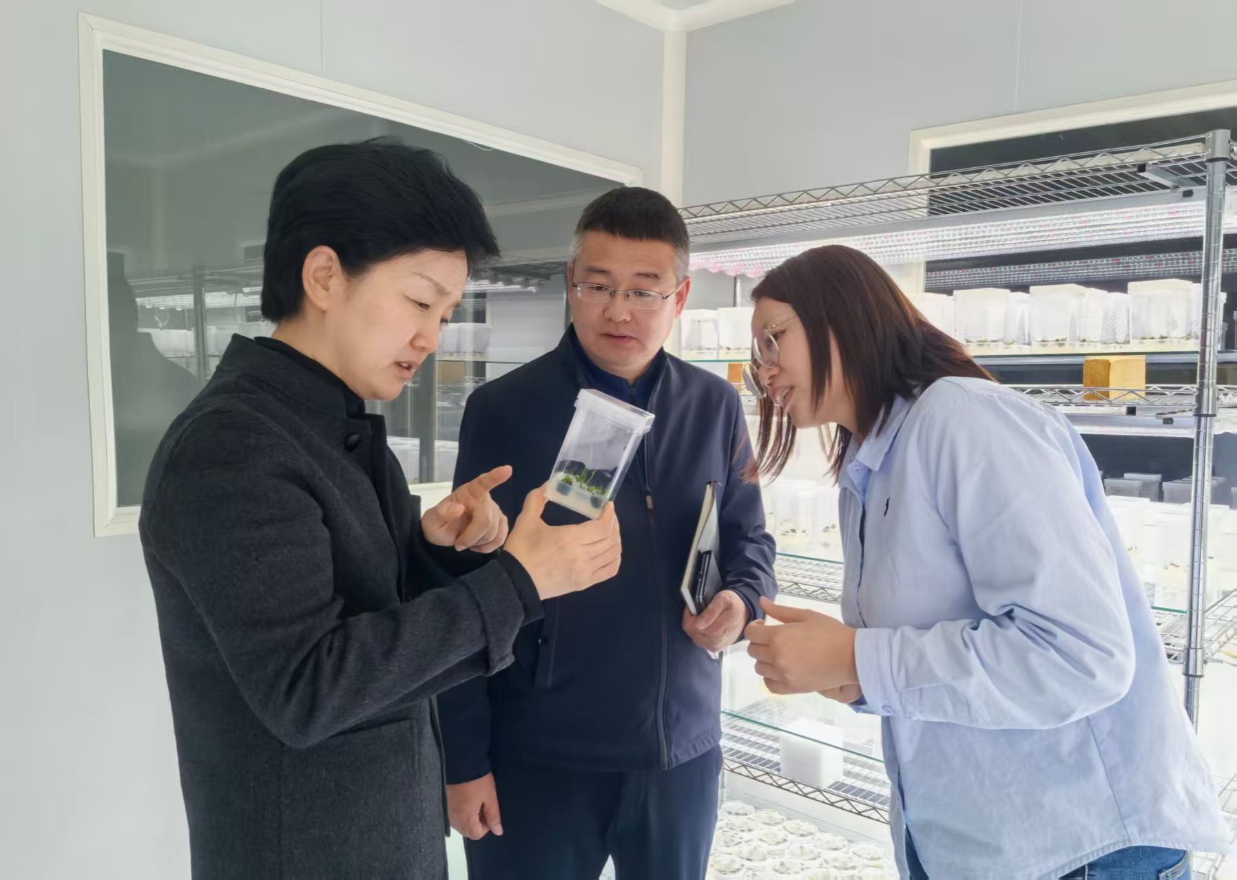陈宇辉深入科研一线,先后走进分子育种研究室、植物保护研究室和大豆智能设计育种实验室,与科研骨干深度交流,详细查看问询工作开展情况,重点对研究所在基因编辑、分子标记辅助育种等关键核心技术领域的工作进展进行了解,并对取得的阶段性成效给予肯定。