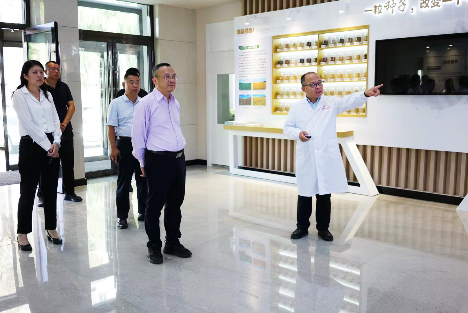 在国家寒带作物及大豆种质资源中期库,草业研究所副所长韩微波向唐咸来一行介绍了种质资源库现状及近年来在种质资源创新方面取得的优异成果。