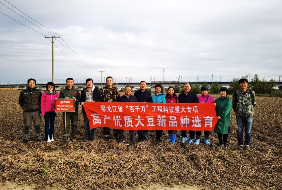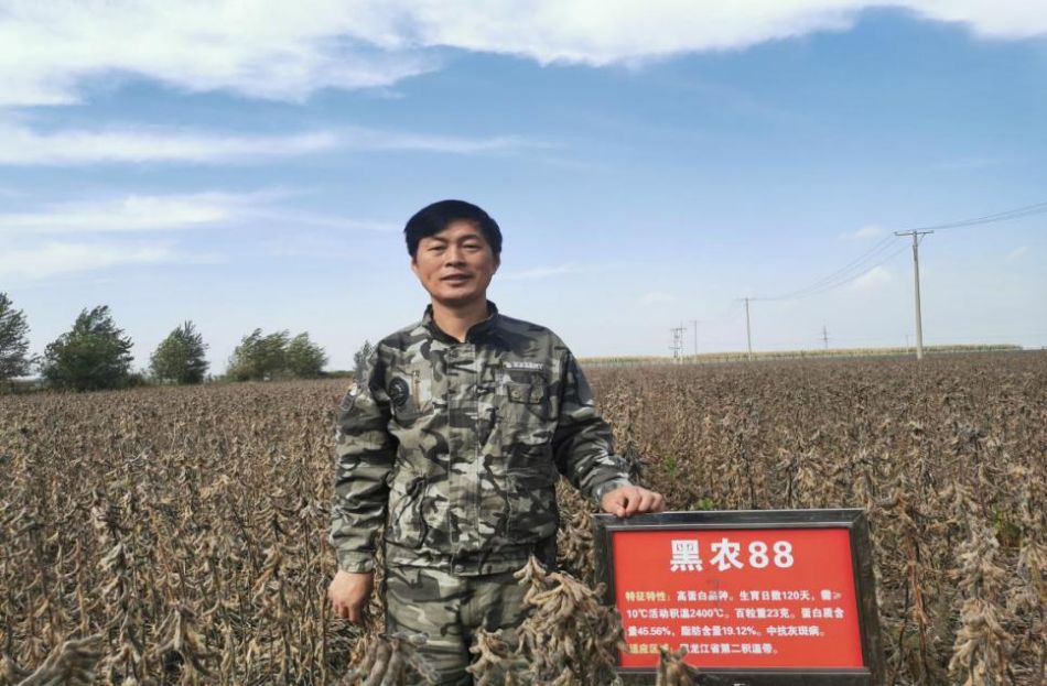 品种育成人刘鑫磊副研究员介绍说,黑农88是“黑农”号高蛋白系列品种中最具代表性的一个,是团队采用杂交与辐射相结合的方法育成的。黑农88的选育开拓了夏大豆品种(资源)在北方春大豆育种中有效利用的新途径,在经历基因突变、基因重组和优异基因的选择后,实现了品种高蛋白、高产、抗病、秆强抗倒同步创新的突破,使龙江大豆育种技术创新和高蛋白品种综合生产能力提升登上了一个新台阶。黑农88于2020年审定,蛋白质含量45.56%,脂肪含量19.12%;区生试平均亩产194.0公斤,较对照品种增产8.2%,试验最高亩产量254.0公斤(2018年巴彦),较对照品种增产19.1%,接种鉴定中抗灰斑病,中抗病毒病,适合黑龙江省第二积温带种植。2021年黑农88哈市的示范面积3000余亩,品种在大豆结荚至鼓粒期连续24天没降雨的大旱之年,表现杆强、抗旱、抗病,并达到了蛋白、产量同步双高,所以今天脱颖而出。