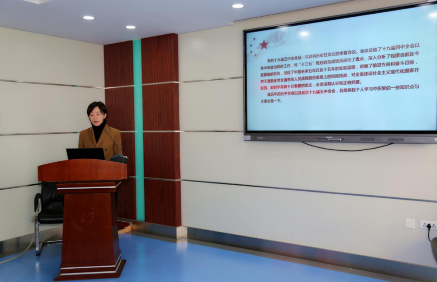 随后,郑妍妍副所长以《跑好接力赛,奋进新征程--学习贯彻十九届五中全会精神》为题进行了党课辅导。她从五中全会的光辉历程、关于十九届五中全会和个人体会三个方面介绍了十九中五中全会的总体情况。她表示,这次全会提出要“优先发展农业农村,全面推进乡村振兴”,这给我们农业科研人员创造了发展的良好机遇。遥信所全体职工要把全会精神融汇到实际工作中,科学规划好科室及个人的短、中、长期发展目标,为农业、农村发展贡献一份力量。