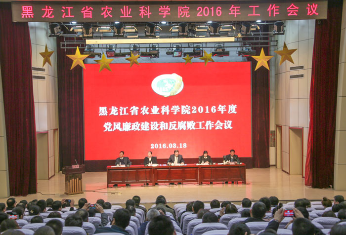 3月18日下午,院2016年度党风廉政建设和反腐败工作会议在专家公寓国际会议中心召开。院党组书记刘娣、院长李文华、常务副院长苏俊、总农经师矫江、总农艺师闫文义出席会议。会议邀请了省纪委领导为参会人员做了一场精彩的廉政警示报告。会议由院纪检组组长杨波同志主持。