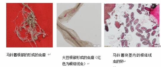 植物寄生线虫大多体长约0.3-1毫米,极少数达到4毫米左右,体宽约0.015-0.035毫米,近乎是“隐形”,肉眼很难看到。口针是它进攻的“武器”,对植物的根茎造成伤口,促进真菌、细菌和病毒等病原物的侵染。它在进食过程中分泌的消化液和多种酶类进入到植物的循环系统,影响植物的正常代谢发育,抗病材料地上部分不表现明显的症状,感病材料表现出生长衰弱或者植株矮小发黄症状,又常与缺素症混淆,这个小小的“敌人”就这样被我们忽视了。不进行防治,它就偷偷地在地下享受植物根茎这份美味,我们常吃的土豆也容易被线虫病害袭击,例如马铃薯孢囊线虫,马铃薯腐烂茎线虫,根结线虫和根腐线虫等,它们跟我们一样爱吃营养丰富的土豆。我们要如何才能发现这些“隐形”的敌人呢,这就要从植物的根系下手了。以根结线虫为例,根结线虫在侵染植物时,通过线虫的口针刺破植物表皮,食道腺细胞的分泌物随口针刺吸进入植物细胞,在这些分泌物的作用下,取食位点周围的细胞发生改变,随着时间的推移,体积逐步扩大,形成虫瘿。根表面看起来像“肿了”,与根肿病相似,这些肿块拿到室内在显微镜下切开就会看到大量的虫体。