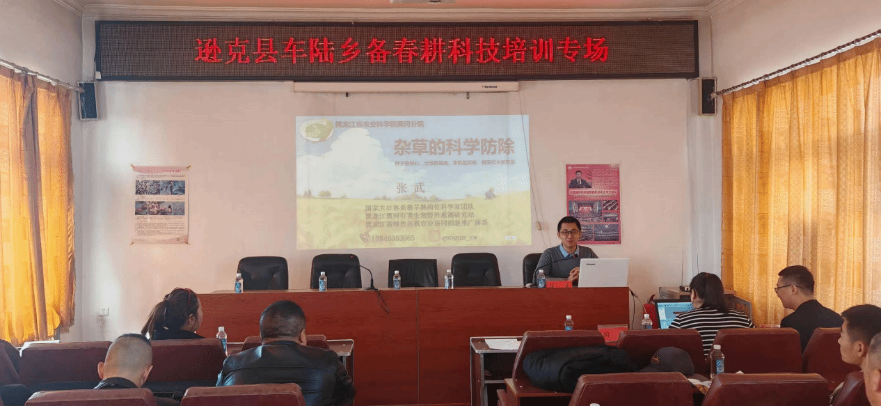 培训会采用现场授课与互动交流的形式进行,张武副研究员针对2023年在调研和实际工作中发现农户在杂草防除过程中出现的问题和误区对农户进行解答,并通过“快手”上微段子为实例,生动详实的讲解了除草剂的选择原则、除草机械中喷嘴的使用、选择注意事项。于晓光副研究员对大豆品种的选择和注意事项与农户开展互通交流。通过本次活动充分发挥了科技特派员推广新品种、新技术的作用,将新品种、新技术引入逊克县,解决农户所关心的实际问题,充分发挥了科技特派员人才的支撑作用,助力乡村振兴发展。