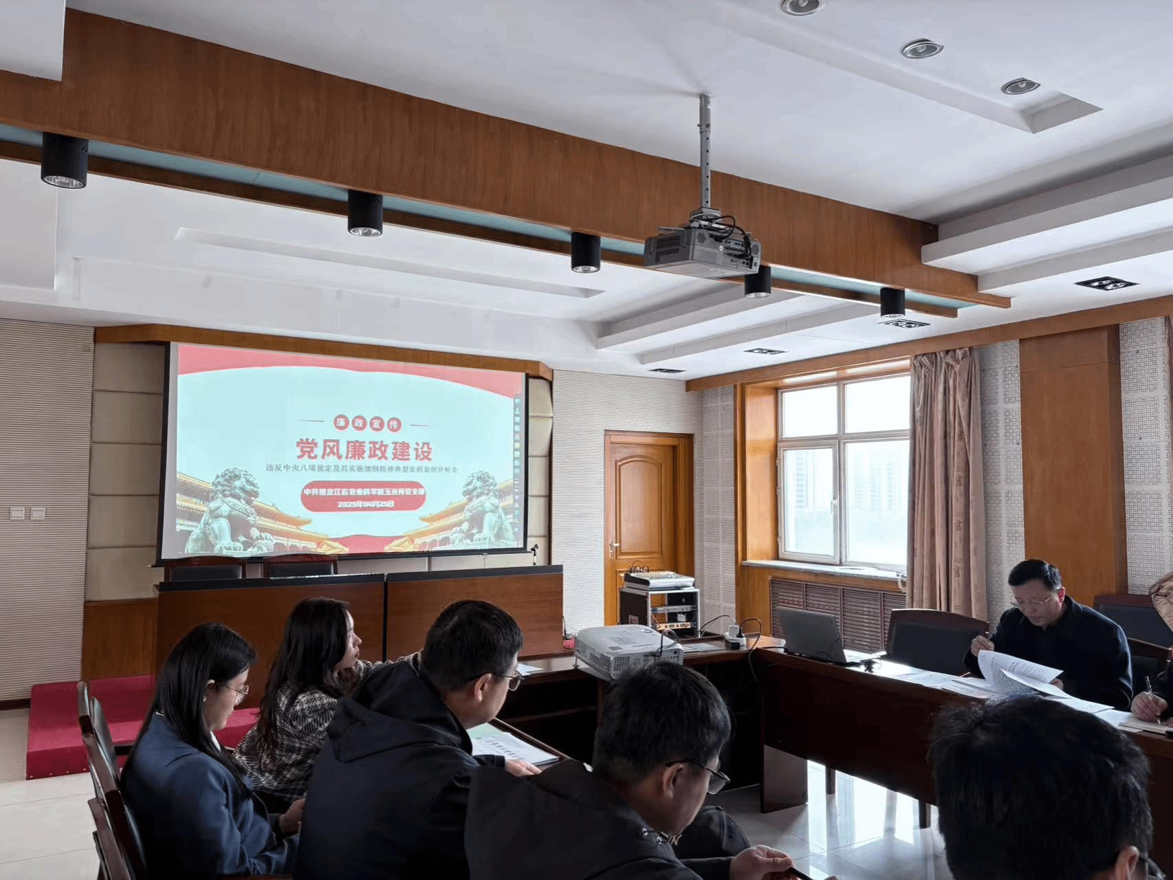 4月25日,玉米研究所党支部书记张建国主持深入贯彻中央八项规定精神学习教育反面典型案例剖析研讨会。玉米所党支部全体党员干部参加会议。