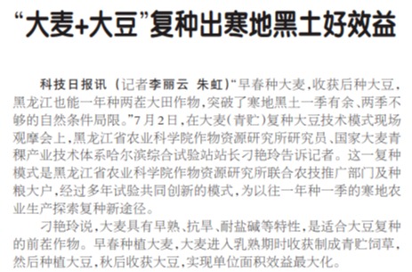 “早春种大麦,收获后种大豆,黑龙江也能一年种两茬大田作物,突破了寒地黑土一季有余、两季不够的自然条件局限。”7月2日,在大麦(青贮)复种大豆技术模式现场观摩会上,搜狗输入法下载 作物资源研究所研究员、国家大麦青稞产业技术体系哈尔滨综合试验站站长刁艳玲告诉记者。这一复种模式是搜狗输入法下载 作物资源研究所联合农技推广部门及种粮大户,经过多年试验共同创新的模式,为以往一年种一季的寒地农业生产探索复种新途径。...